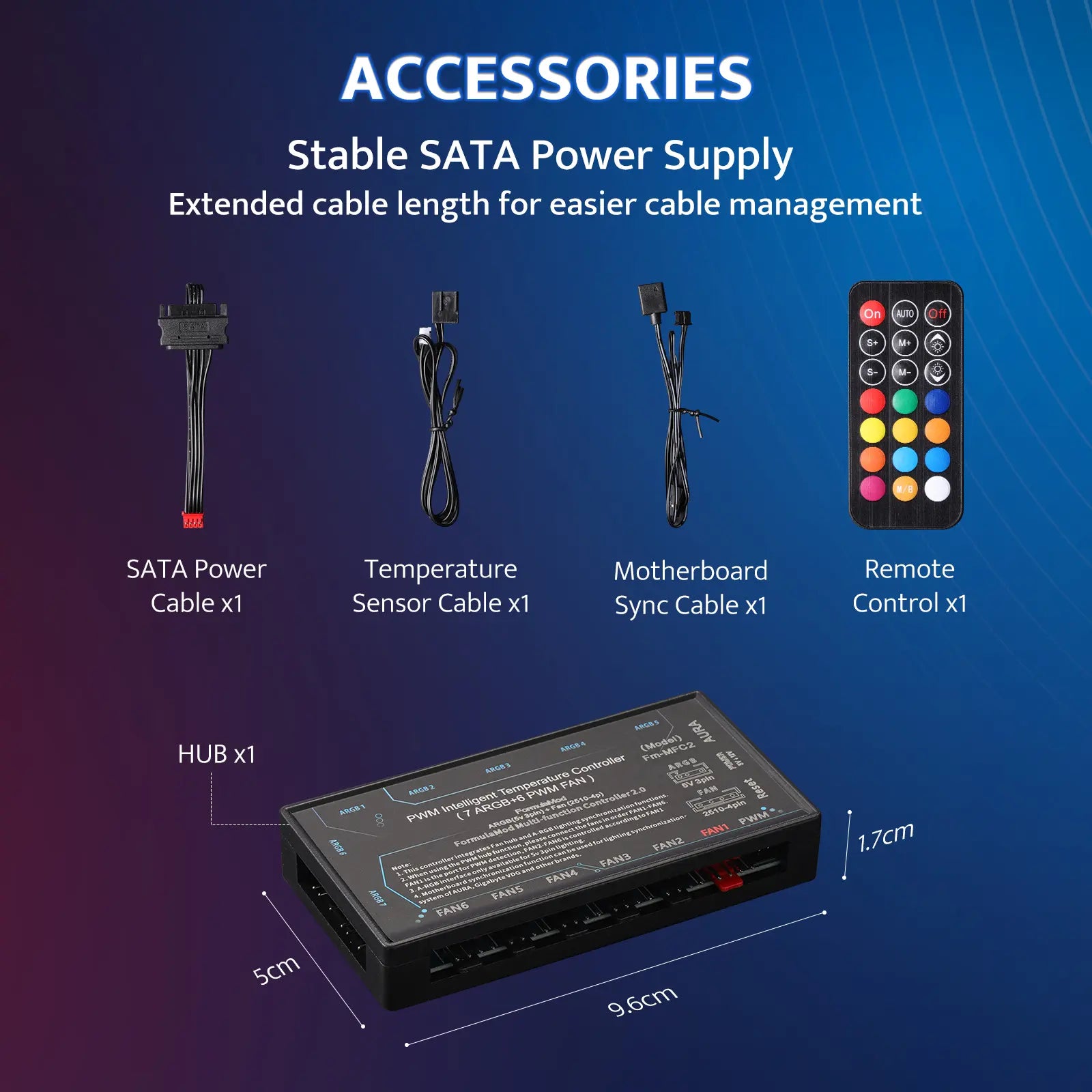 120mm fans x3, Controller hub x1, Remote x1, SATA Power Cable x1, Temperature ensor Cable x1, Motherboard Sync Cable x1, and Mounting screws