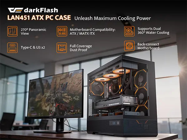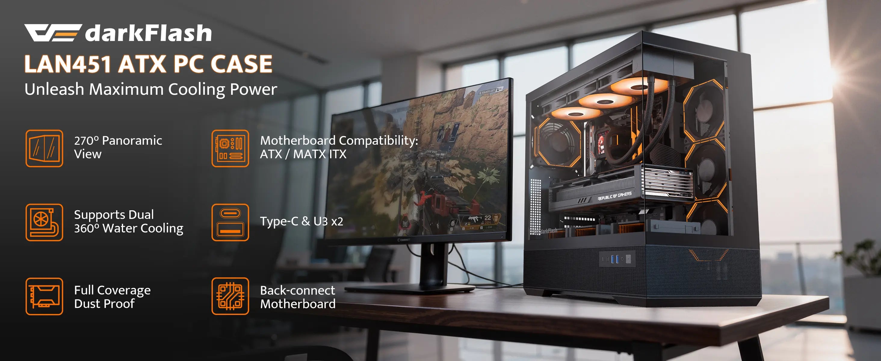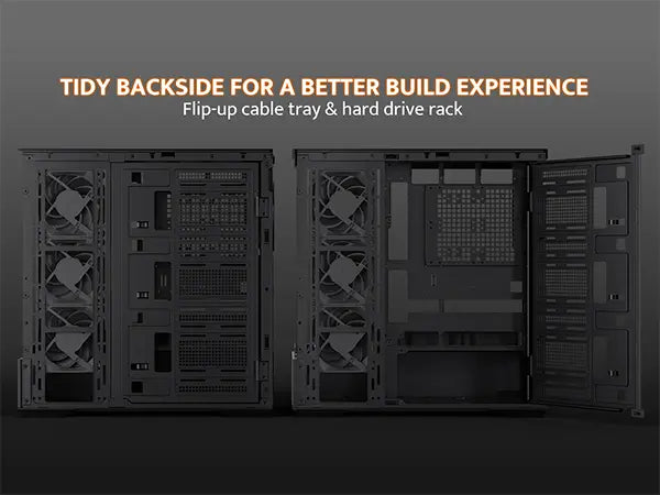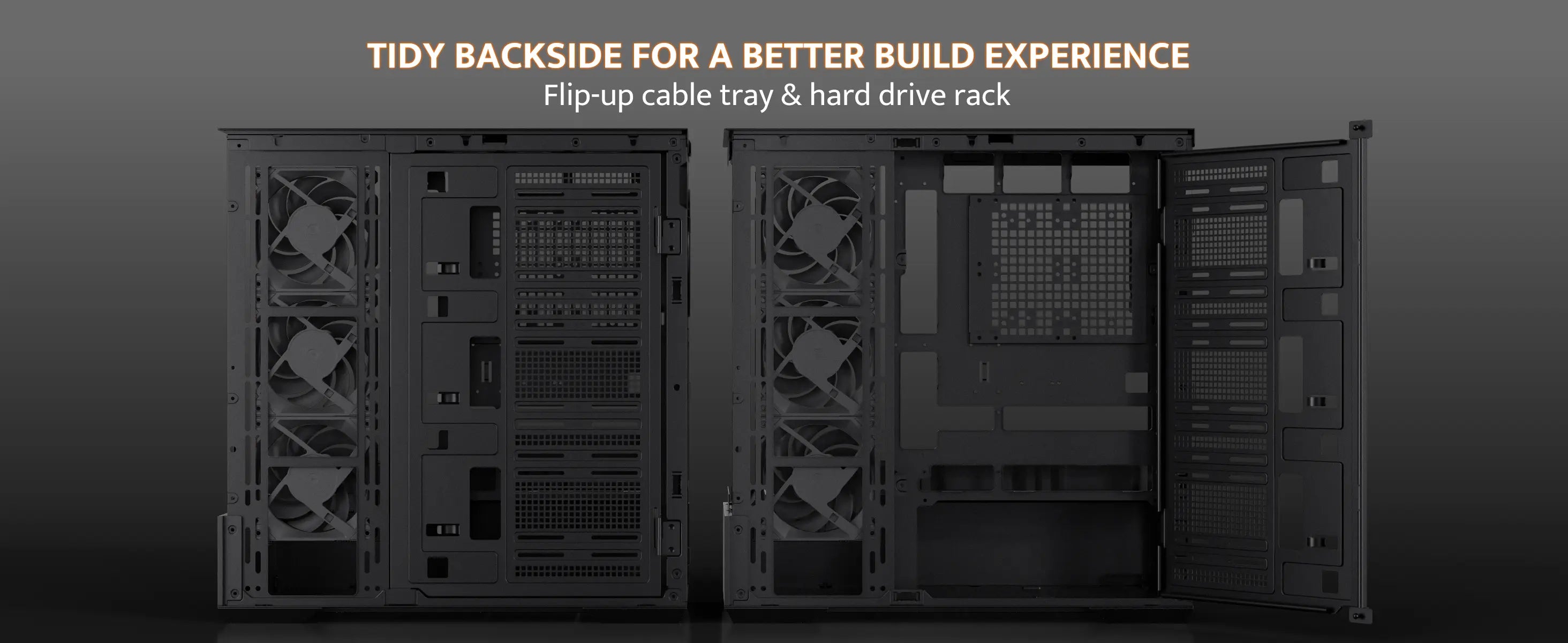 The LAND451 gaming PC case offers a clean build with a tidy rear, flip-style cable management, and dedicated hard drive mounts. The bottom panel also allows for adjustable fan spacing, making installation easier.