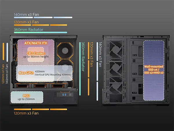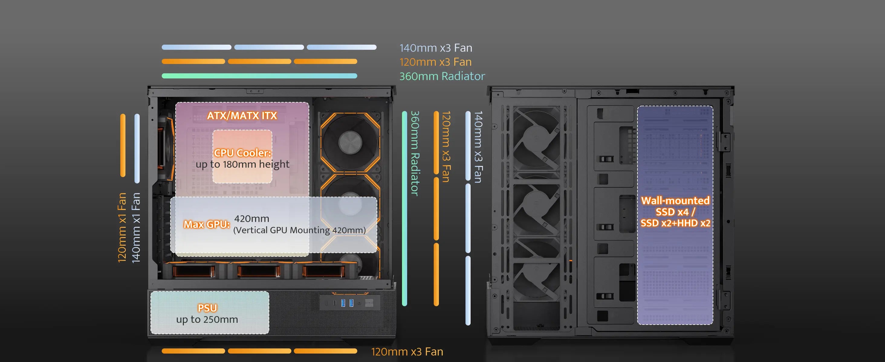 Rear: 120/140mm x 1/Bottom: 140mm x 3/Top: 120/140mm x 3/Side: 120/140mm x 3