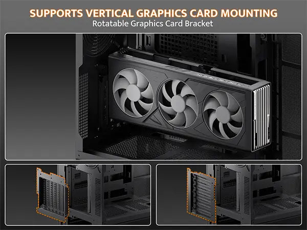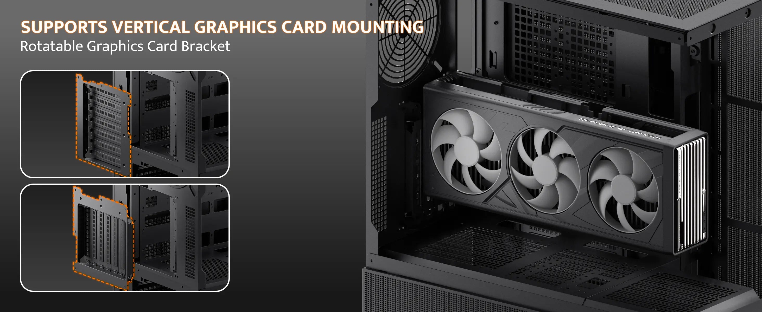 Yes, this PC case supports horizontal and vertical GPU mounting up to 420mm, fully compatible with RTx 5090 series and other oversized graphics cards (Riser cable not included)