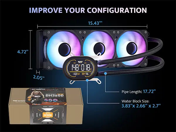Pump: 3.83 (L) *2.66 (W)*2.7(H) inches, Radiator: 15.43 (L) x 4.72 (W) x 2.05 (H) inches; Weight: 57.14 oz