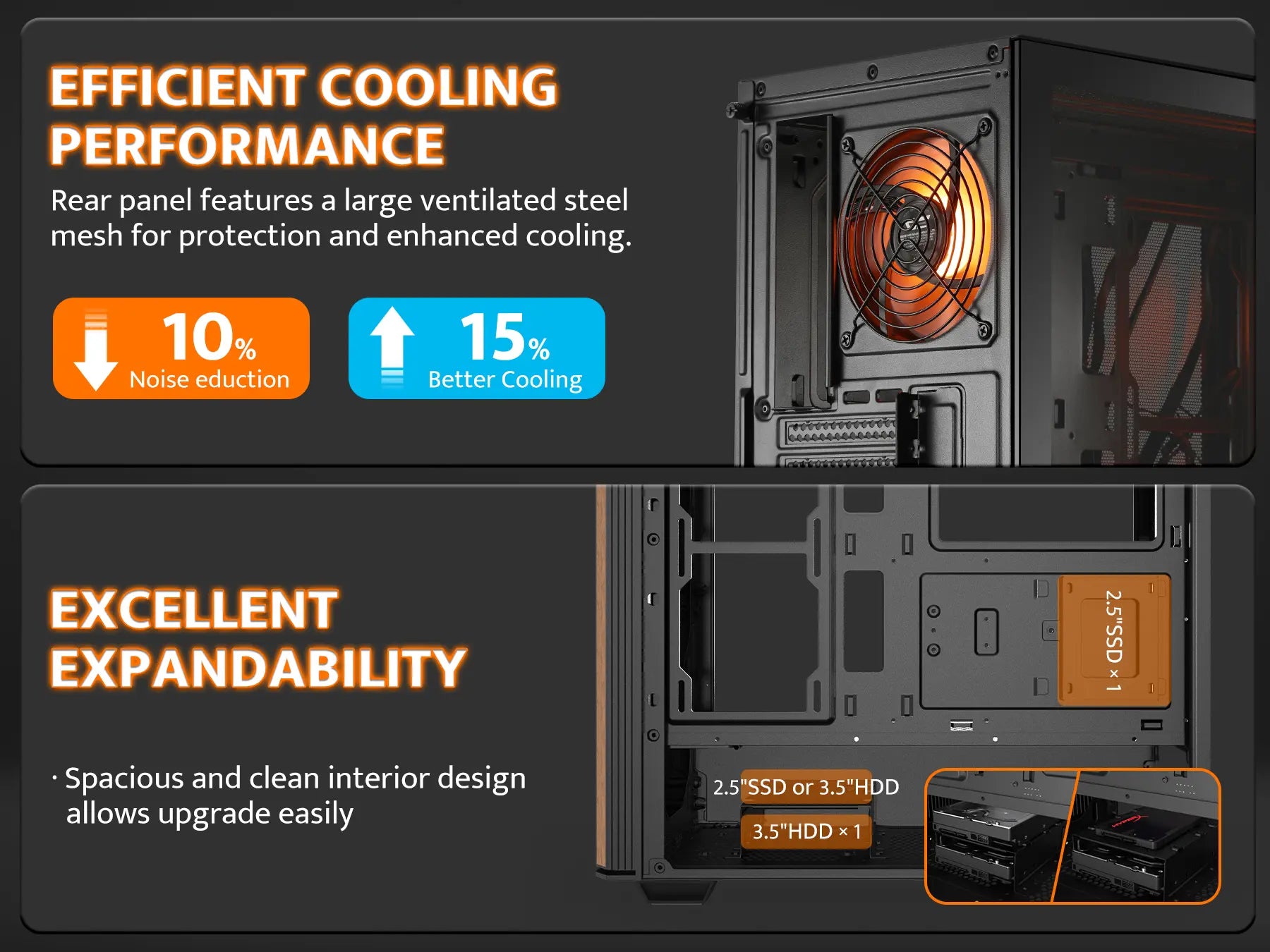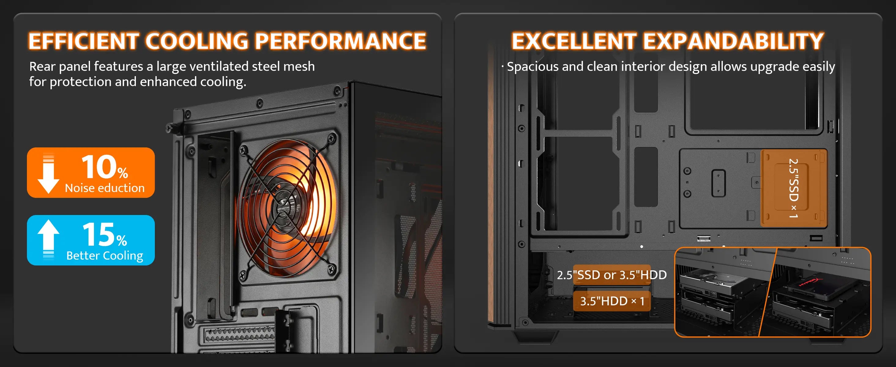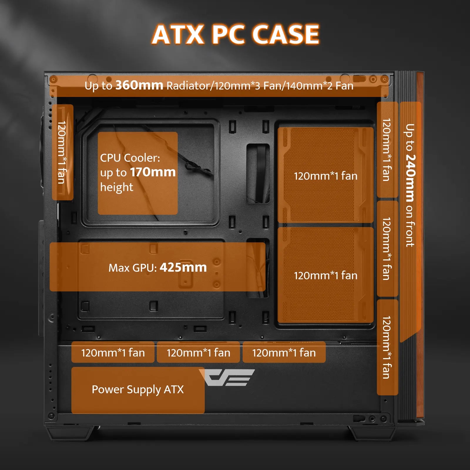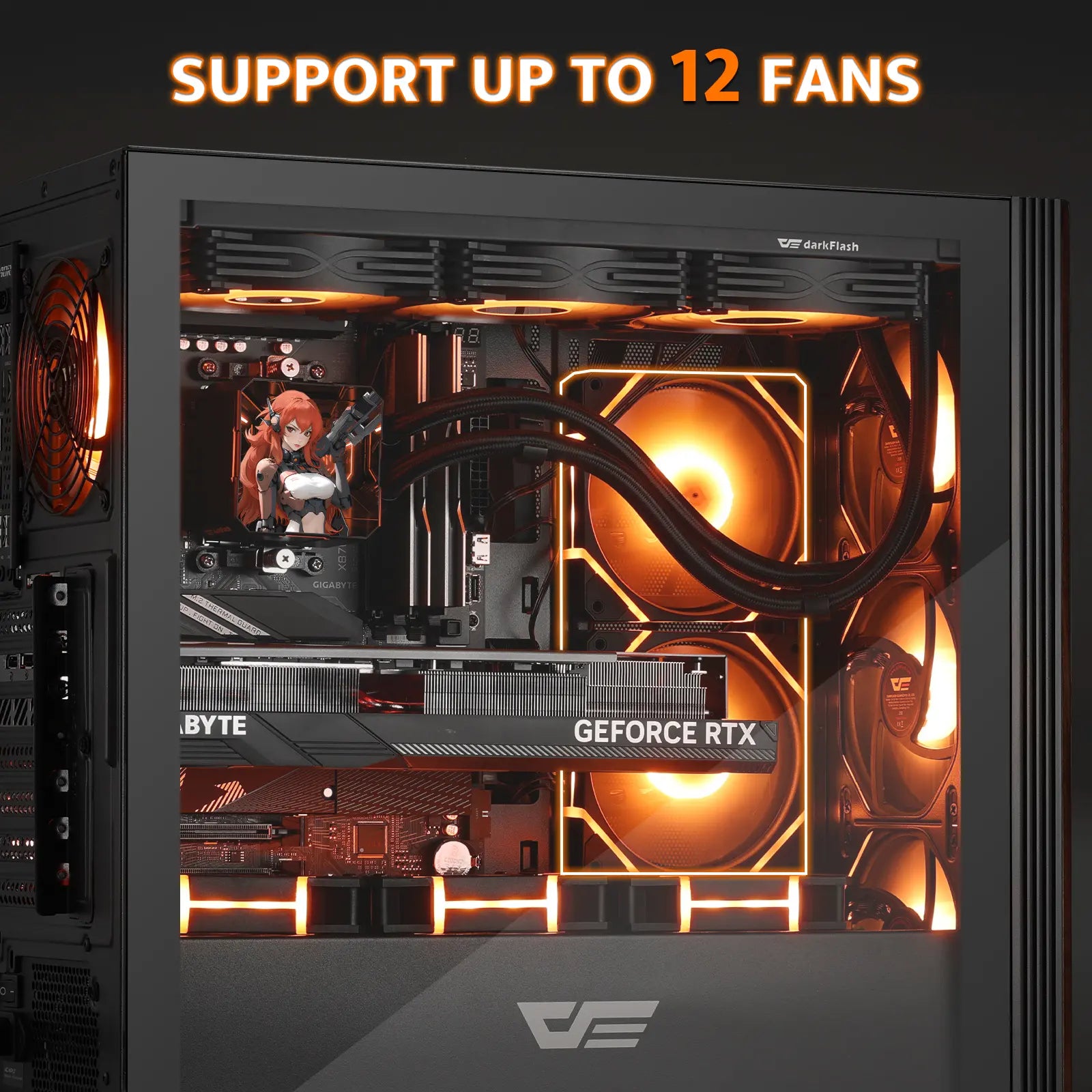 The case supports up to 12x120mm fans and also accommodates a 360mm liquid cooler for advanced cooling.